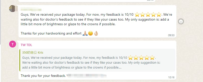 Guys, We've received your package today. For now, my feedback is 10/10. We're waiting also for doctor’s feedback to see if they like your cases too. My only suggestion is: add a little bit more brightness or glaze to the crowns if possible. Thanks for your hard work and effort.